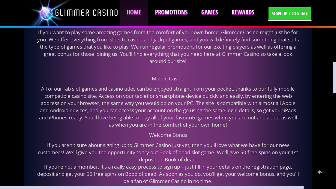 Most Progress Play casinos offer generous welcome bonuses, including Glimmer casino. The welcome pack for newcomers provides a 100% match up to $100 + 20 Free Spins on the Book of Dead slot. There is only one welcome bonus per new player. You cannot withdraw the bonus as cash but must wager at least 50x to withdraw any winnings from the bonus.