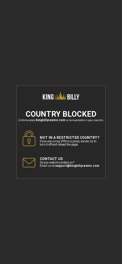 A drawback of this casino is that it doesn’t accept quite many countries. King Billy does not accept players from the following countries: Afghanistan, Estonia, Iran, Turkey, Gibraltar, Jersey, Greece, China, Jamaica, Cambodia, Iraq, Syria, Myanmar, Lao PDR, Angola, Cape Verde, Paraguay, Macau, Hong Kong, Albania, Pakistan, Lebanon, Cote D’Ivoire, Iran, Guatemala, Angola, Albania, Iraq, Jamaica, Uganda, Pakistan, Islamic Republic of Iran, Panama, Lebanon, Zimbabwe, Mauritius, Nicaragua, Yemen, Central African Republic, Côte d'Ivoire, Sudan, Liberia, Cayman Islands, Somalia, Congo, North Korea, Eritrea, Haiti, Sierra Leone, Ethiopia, Myanmar, South Sudan, Burkina Faso, Libya, Mali, Barbados, Rwanda.