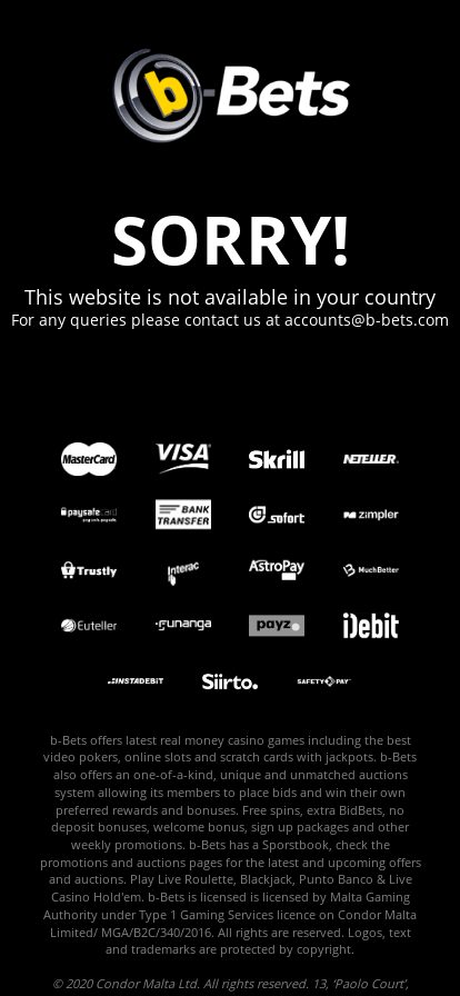 Due to strict rules and regulations, residents of the United States, the United Kingdom, Australia, Spain, Denmark, Italy, and Portugal are not allowed to register an account and taking part in casino activities at b-Bets casinos.