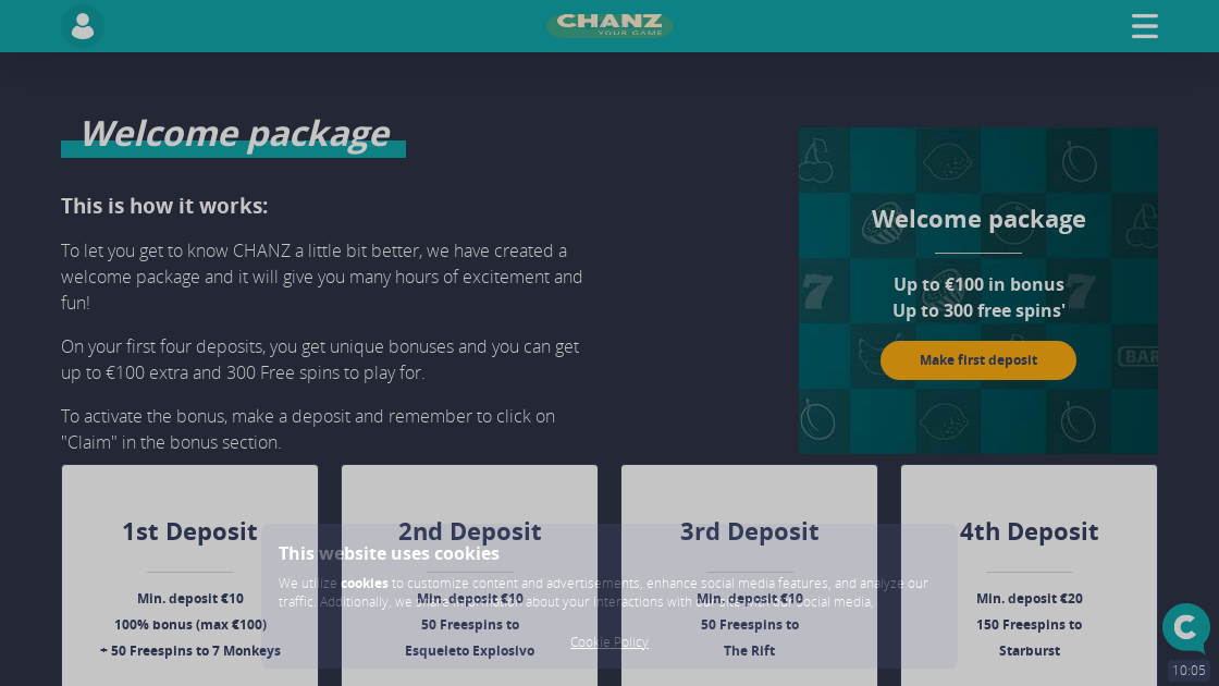 After you make your first deposit and use the CHANZ1 bonus code, the casino will instantly grant you a 100% match bonus in amounts up to $ / € 100 and 50 free spins on the game Video slot provided by NetEnt Aloha. When you make a second transfer with the code CHANZ2 completed, you will receive 50 free spins on Thunderkick and Esqueleto Explosivo. Upon completing the third deposit with the CHANZ3 bonus code, the casino will offer 50 free spins on Thunderkick and The Rift. And yet, for your fourth deposit with a minimum amount of $ / € 20, you will get three times the previous guarantee’s free spins.