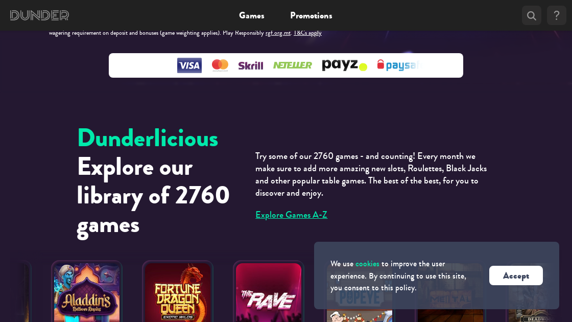 Dunder casino offers you hundreds of quality games from top vendors, including NetEnt, Microgaming and Play'n Go. You will have a wide range of choices such as slot machine games, jackpot games, live casino, and table games. This is a casino that is appreciated for its diverse type of play.